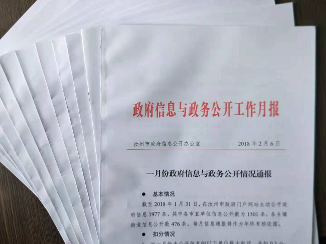 一是进一步强化工作机制。为实现政府信息和政务公开工作依法、规范、有序、安全进行,汝州市政府信息公开办在现有工作制度的基础上,进一步完善了日常监测及通报机制,不断加大对各发文主体的监督指导力度,每天定时对当天新增信息抽检、审核,确保市政府门户网站的严谨、规范。针对问题信息,及时联系发布主体限时整改,并扣除相应目标考核分值;每月对各单位发文数量进行统计,制作印发《政府信息与政务公开工作月报》(每月一期),及时向各单位反馈上一月工作情况,并要求各单位在接收月报后报单位一把手审阅签字,掌握政府信息和政务公开工作动向,形成赶超局面。