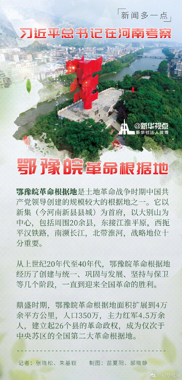 【学习进行时】习近平总书记16日在河南省考察调研。当天下午,他首先来到位于新县的鄂豫皖苏区首府烈士陵园,向革命烈士纪念碑敬献花篮,瞻仰革命烈士纪念堂。随后,他参观了鄂豫皖苏区首府革命博物馆,并看望了当地红军后代、烈士家属代表。习近平总书记一直牵挂着大别山革命老区。新华社《学习进行时》原创品牌栏目“讲习所”今天推出文章,为您梳理解读。