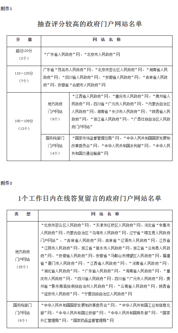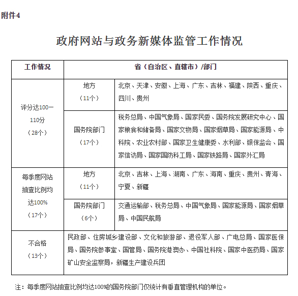 本次检查将各地区、各部门政府网站和政务新媒体监管工作纳入考评。总的看,各地区、各部门积极落实监管责任,加强监督考核,基本实现常态化监管。其中,北京、天津、安徽等11个地区得分靠前;税务总局、中国气象局、国家民委等17个国务院部门得分靠前。31个省(自治区、直辖市)和外交部等44个国务院部门均按季度对本地区、本部门政府网站和政务新媒体开展抽查巡查,并向社会公开抽查结果。北京、吉林、上海等11个地区和交通运输部、税务总局、中国气象局等国务院部门每季度网站抽查比例均达100%。江苏、安徽、江西、湖南等地区进一步规范政务新媒体监管,在加强内容建设的同时,关停整合功能重复或相近、长期不更新、用户关注度低的政务新媒体。