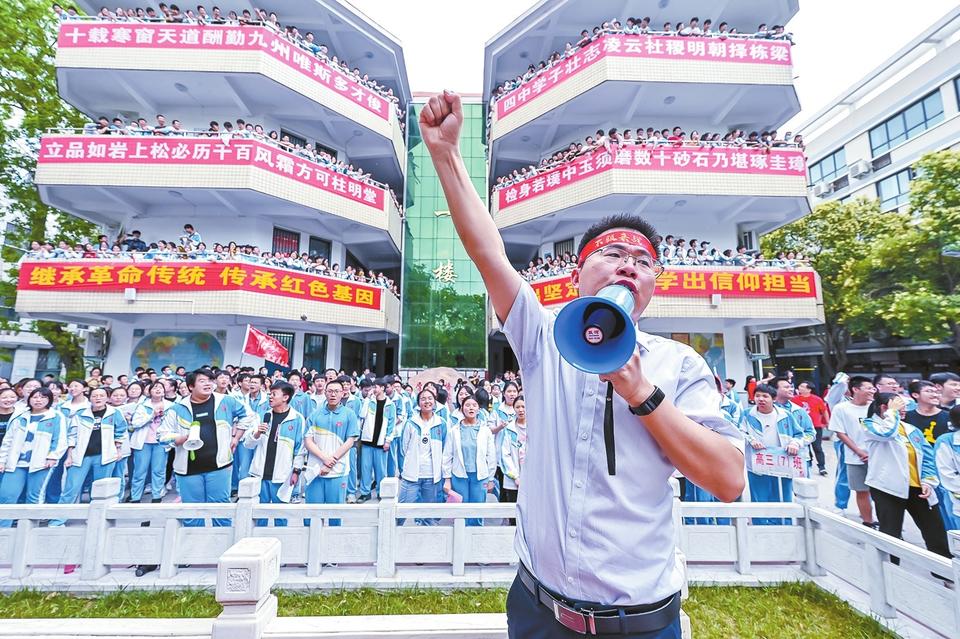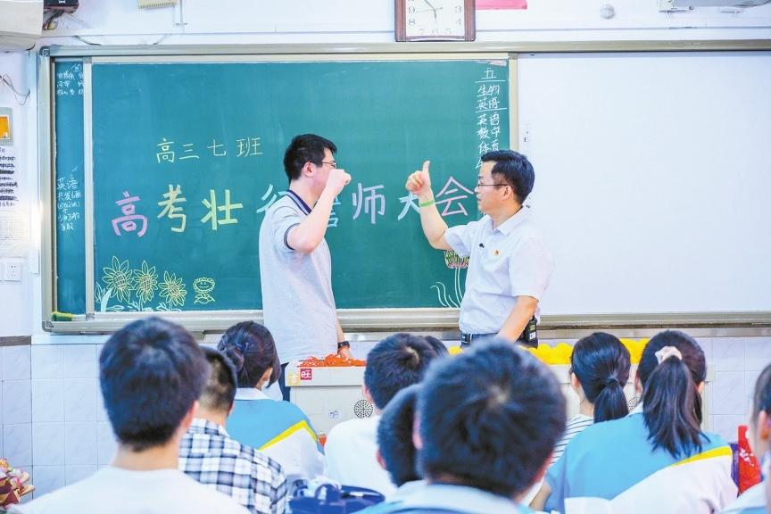 郑州四中,班主任在高考壮行誓师大会上,和学生击掌加油