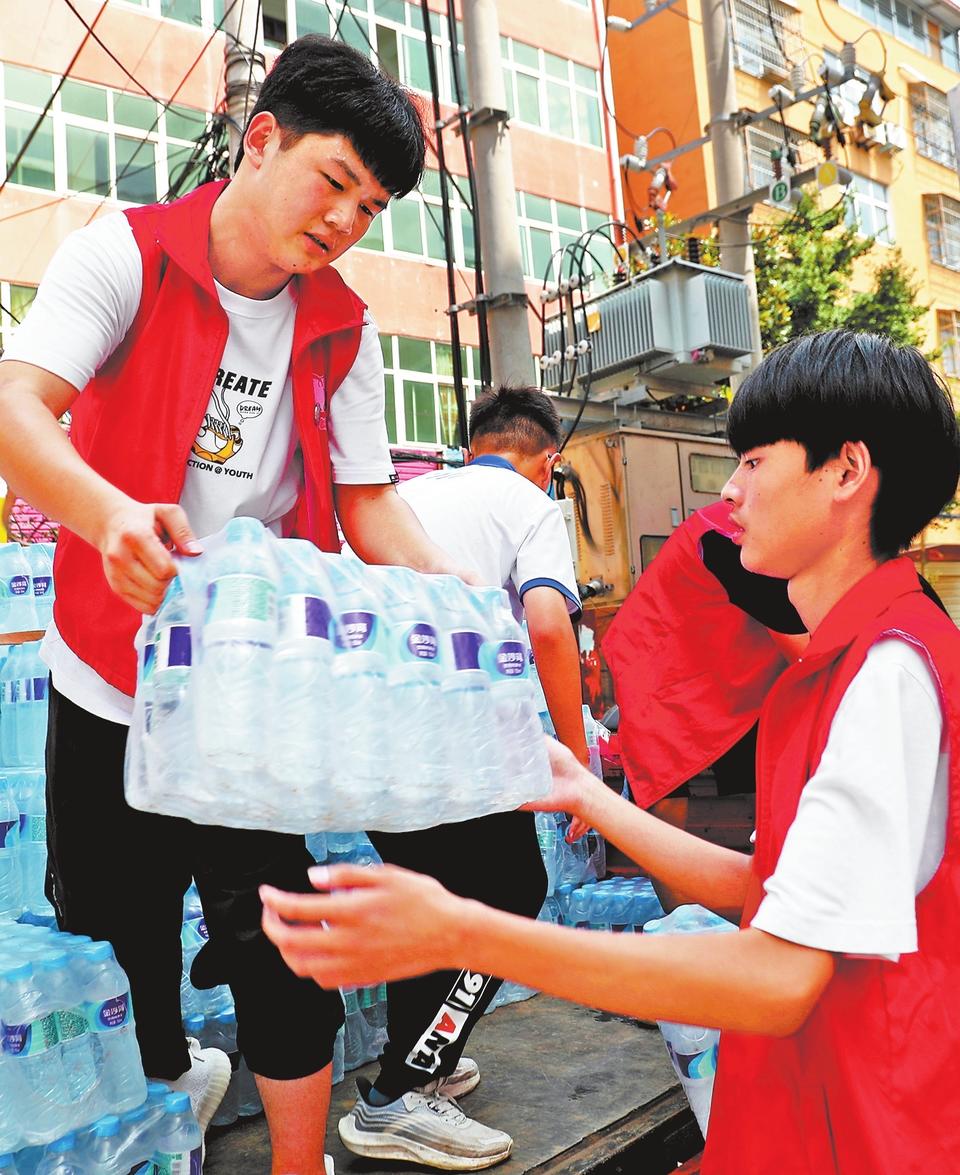 7月25日,在鄢陵县第二初级中学受灾群众安置点,大中专及初高中学生在搬运救灾物资。(牛书培 摄)