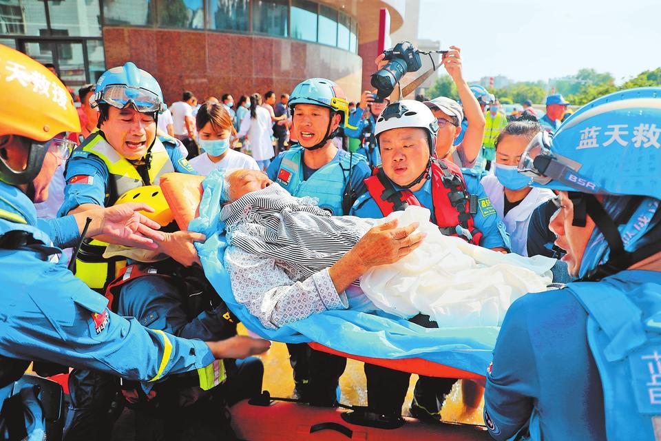 7月26日,卫辉市内涝,新乡医学院第一附属医院受淹严重,志愿者紧急组织病人转移。(记者 王铮 摄)