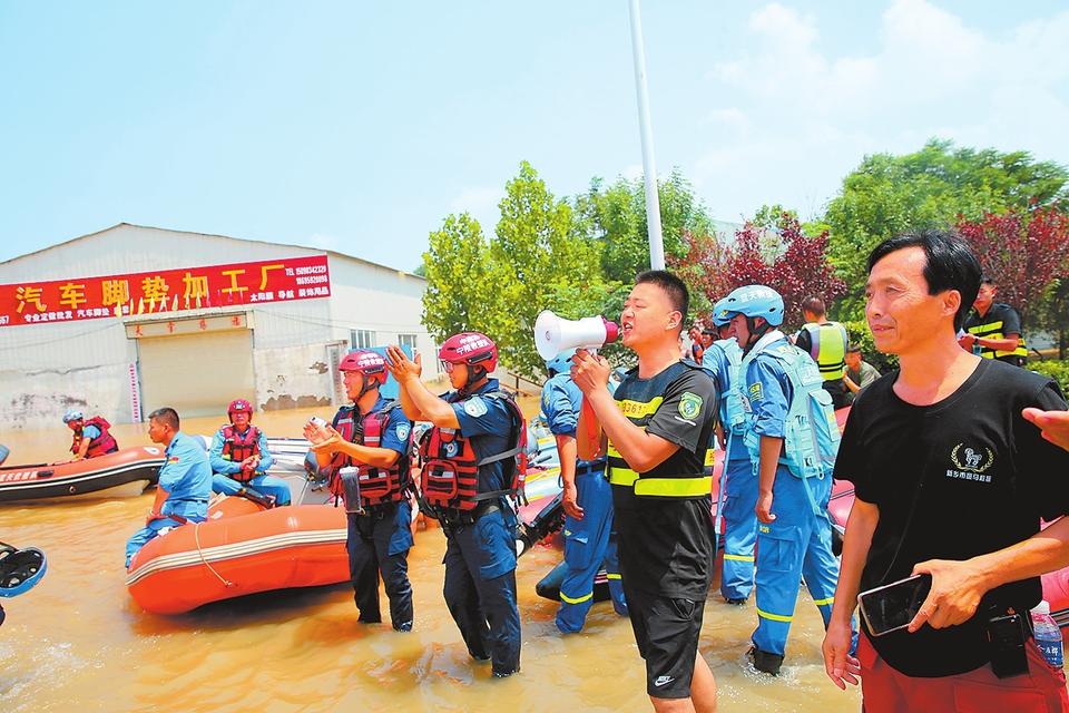 7月24日,在新乡市牧野区王村镇救援现场,志愿者为大家加油鼓劲。(记者 王铮 摄)