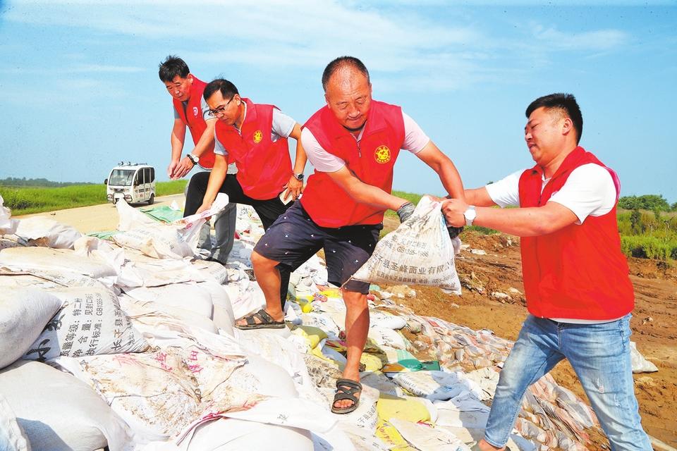 7月29日,焦作市解放区健康产业园区组织志愿者加固大沙河险工险段,确保河道两岸群众生命财产安全。(李良贵 摄)
