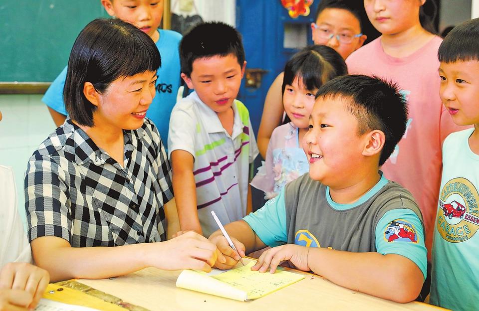 7月26日,在尉氏县邢庄乡博文学校受灾群众安置点,志愿者在给受灾村庄转移过来的孩子们辅导暑假作业。(李新义 摄)