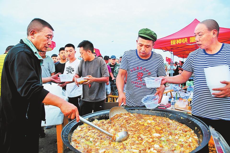 7月27日,在卫辉市大禹湖临时救援点,来自山西晋城的薛志杰团队正为救援人员准备热腾腾的饭菜。(记者 王铮 摄)
