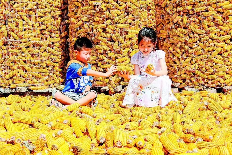 9月22日,儿童在永城市黄口镇李老家村农户院落的玉米堆中玩耍。(聂政 摄)