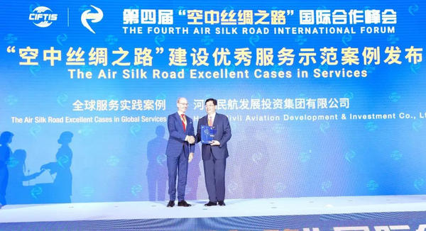 2022年9月4日,在第四届“空中丝绸之路”国际合作峰会上,卢森堡驻华大使俞博生为河南航投颁发本届峰会“全球服务实践案例”证书。(图片来源:河南航投集团)
