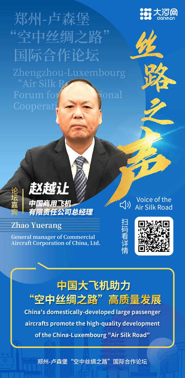 “通过完整的产品谱系、丰富的产品系列、繁荣的产业生态,为全球用户提供更多飞机产品选择及运营解决方案,服务‘空中丝绸之路’沿线国家及相关企业;通过‘空中丝绸之路’的建设,共同推动郑州国际航空枢纽建设和临空经济发展,服务河南全方位对外开放;借助‘空中丝绸之路’的发展,围绕大飞机的产业链供应链建设、新技术开发、节能减排应用、人才交流等方面,开展广泛深远的合作。”