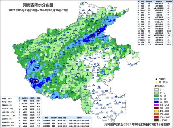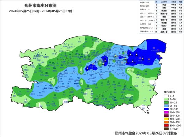 根据监测,全省平均降水量11.2毫米,有55个县(市、区)大于25毫米,其中23个县(市、区)大于50毫米,位列前三的分别为:淅川县蒿坪101.0毫米、淅川县王家庄99.5毫米、封丘县青堆90.8毫米。郑州市25日夜间至26日凌晨,自西向东出现中到大雨,东北部暴雨,平均降水量23.1毫米,最大降水量出现在中牟大孟为74.7毫米。
