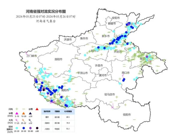 ▲5月25日7时至26日7时河南省强对流实况分布图