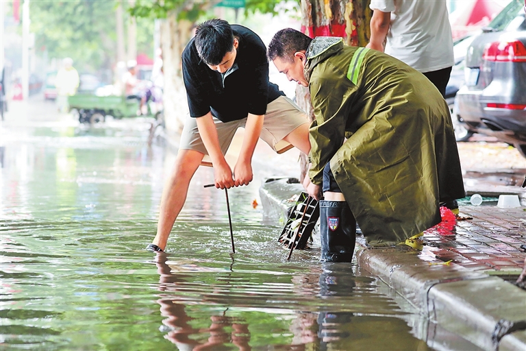 7月17日,温县住建局工作人员在疏通排水管道。徐宏星 摄