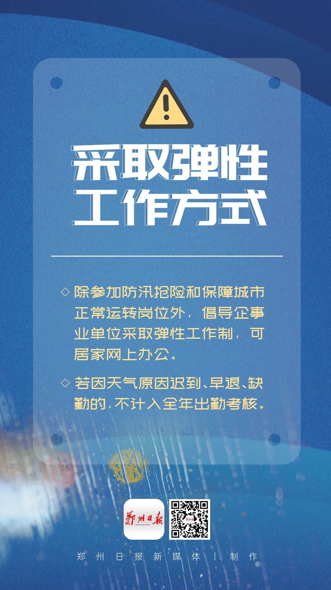 二、采取弹性工作方式。除参加防汛抢险和保障城市正常运转岗位外,倡导企事业单位采取弹性工作制,可居家网上办公。若因天气原因迟到、早退、缺勤的,不计入全年出勤考核。