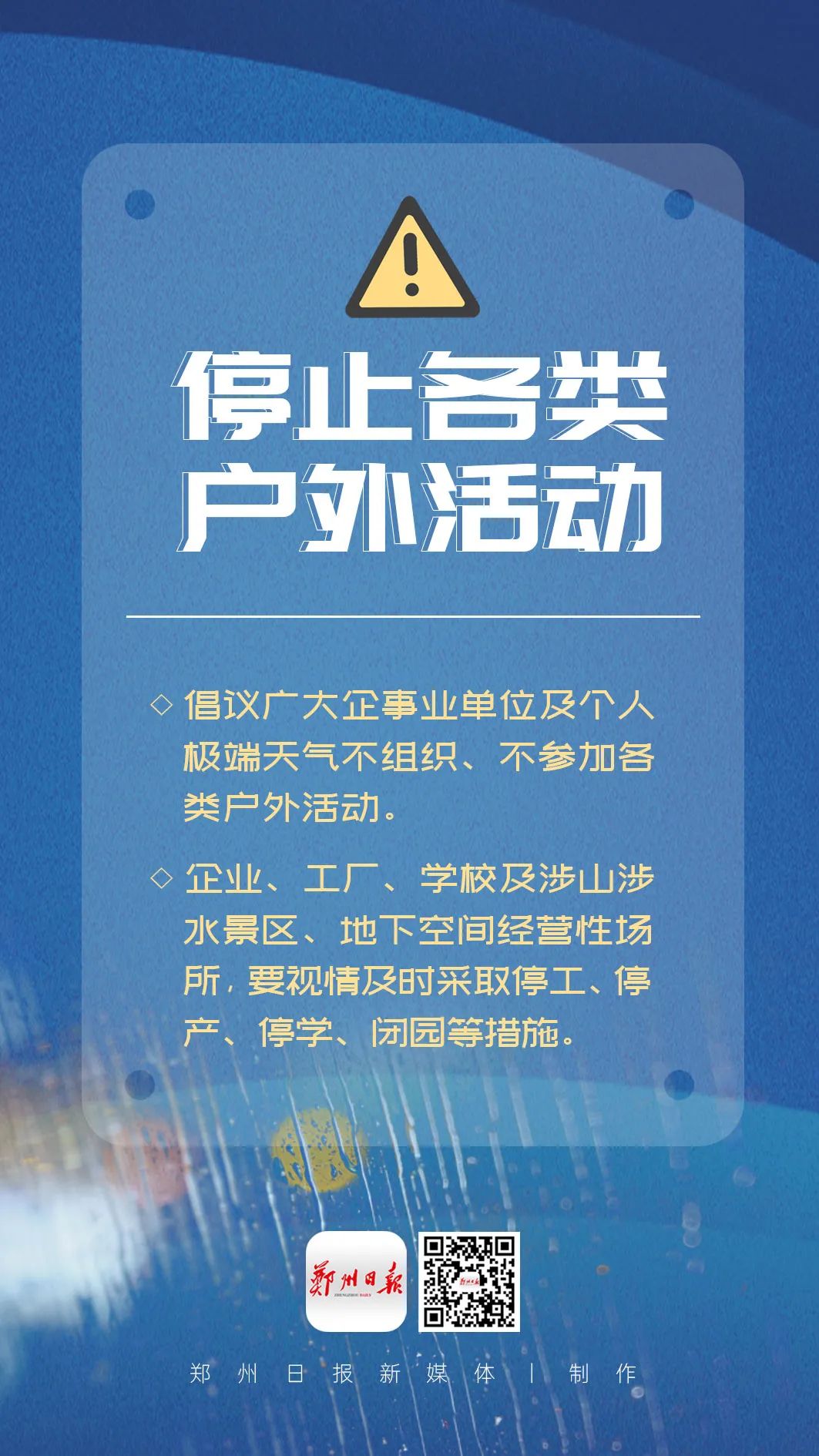 三、停止各类户外活动。倡议广大企事业单位及个人极端天气不组织、不参加各类户外活动。企业、工厂、学校及涉山涉水景区、地下空间经营性场所,要视情及时采取停工、停产、停学、闭园等措施。