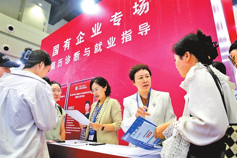 招聘现场,工作人员正在为求职者答疑解惑。