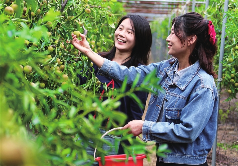 9月12日,游客在鄢陵县马坊镇周陈乔村村民宋要黎的枣园内采摘冬枣。近年来,鄢陵县鼓励引导群众种植猕猴桃、冬枣、樱桃等果树,打造集休闲采摘、农事体验、研学游学等于一体的乡村采摘园,发展乡村休闲观光游,鼓起群众的“钱袋子”。牛书培 摄