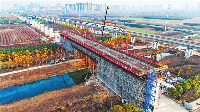 12月6日,经过连续30多个小时的紧张施工,中铁十五局平漯周高铁站前5标段中的舞漯特大桥跨唐江河连续梁成功合龙。 (记者 聂冬晗 摄)