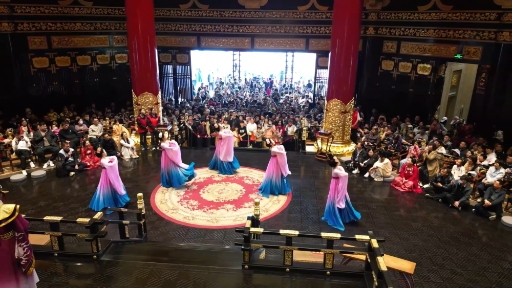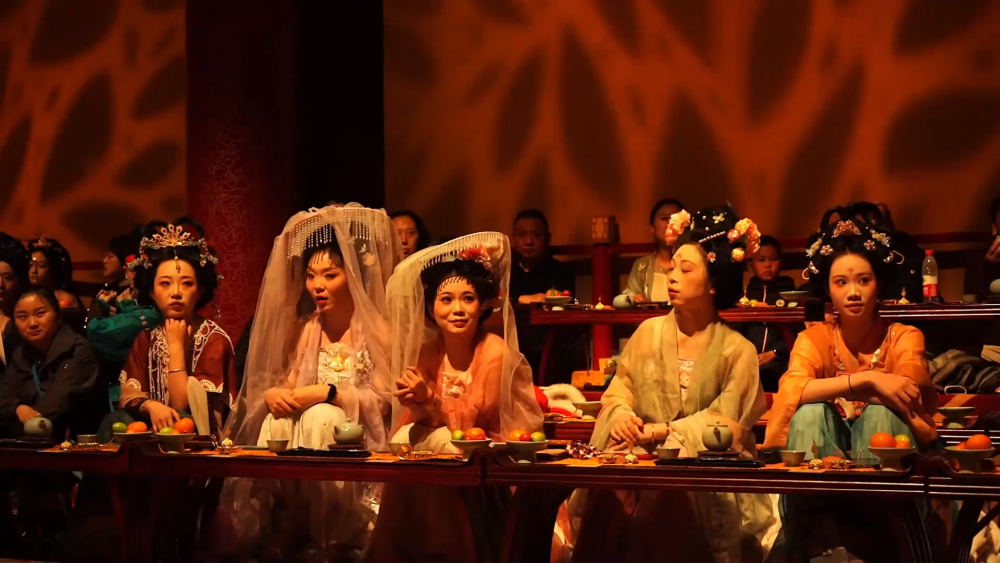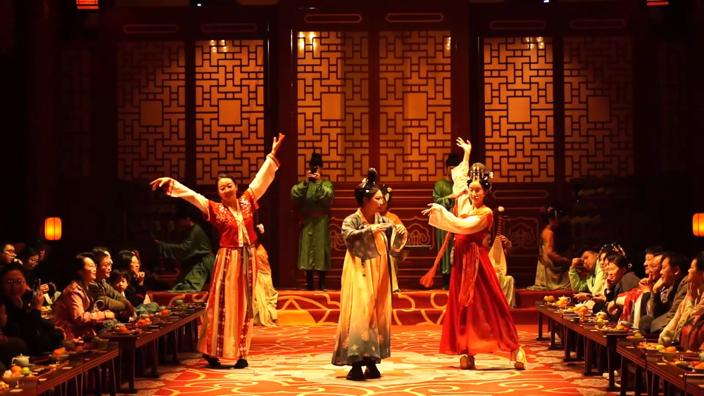 在河南洛阳隋唐洛阳城《唐宫乐宴》现场,游客扮演文武百官进宫赴宴,沉浸式体验大唐的服章之美、歌舞之妙、人物风流。
