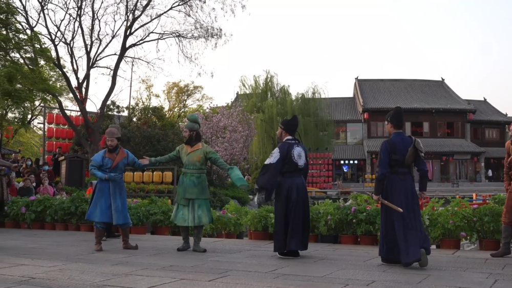 在洛邑古城,园区内的互动活动趣味十足。游客在游玩过程中会遇到月老、武则天、胡人牵驼等各类NPC,让游客深度融入古城的江湖故事,感受浓厚的市井气息。