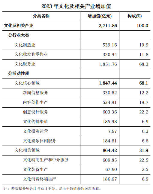 分领域看,2023年,文化核心领域增加值为1847.44亿元,占文化及相关产业增加值的比重为68.1%;文化相关领域增加值为864.42亿元,占比为31.9%。
