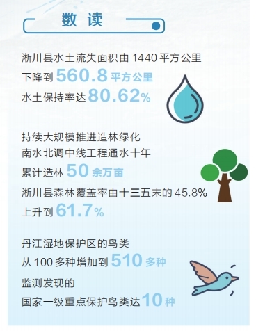 十年前,库区裸露的红土坡残留着采矿形成的工业污水,如今已被茂密的马尾松林覆盖;曾受化肥农药残留侵蚀的一个个库湾,已蜕变成黑鹳等珍稀鸟类的栖息地,Ⅱ类水质达标率从83%跃至100%……