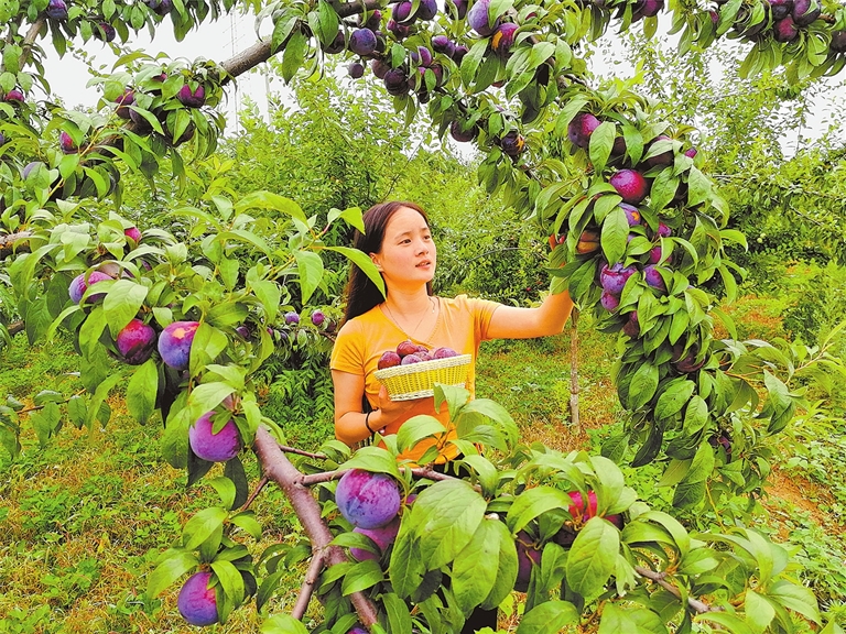 在淅川县老城镇叶沟村生态果园,游客正在采摘杏李。